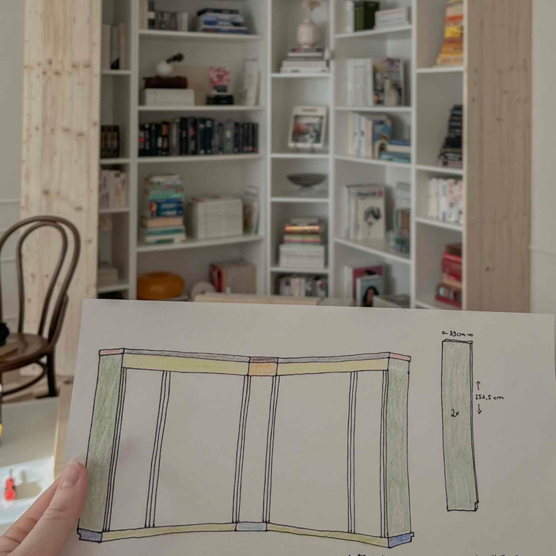 Damit du deine Regale mit Blenden richtig verkleiden kannst, ist das korrekte Vermessen vorab wichtig. Interessieren dich unsere konkreten Maße, kannst du auch zu unserer Projekt-Skizze runter scrollen.