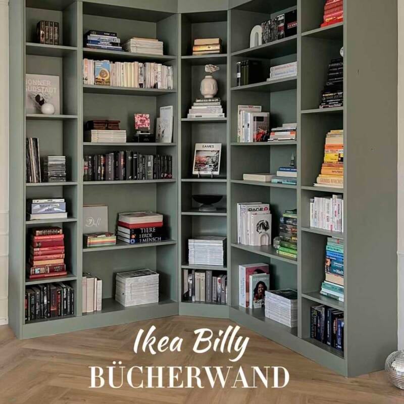 Wir haben uns für eine Einbau-Bücherecke aus 5 Ikea Billy Regalen mit Aufsatz entschieden: eine Kombi aus zwei 80 cm breiten und drei 40 cm breiten Billys. Die drei schmalen Billys stehen links und rechts außen sowie eins in der Mitte - dieses haben wir schräg in die Ecke gestellt. Für die 5 Billys haben wir 450 € gezahlt. Damit das Regal wie ein Einbauschrank wirkt, benötigst du Blenden: Die Blenden und Kanthölzer aus dem Baumarkt haben mit Zuschnitt 120 € gekostet. Für Acryl, Spachtel, Zollstock, Montagekleber, Winkel und Schrauben haben wir 60 € bezahlt und für den Möbellack 100 €. Die Einbau-Konstruktion kostet insgesamt 180 €. Die gesamte Bücherwand inklusive der 5 Billys und Möbelfarbe kostet uns 730 €.